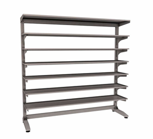 Estrutura em Aço Carbono SAE 1010; 06 unid. Prateleiras em Aço carbono com reforço, medida P-350 mm; 01 unid. Tampo Superior em Aço Carbono; 04 unid. Pés niveladores;