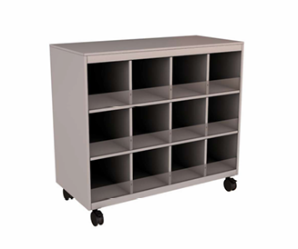 Estrutura em Aço Carbono SAE 1010; 12 unid. Nichos 300 x 300mm c/ Frontal 100mm; 04 unid. Rodízios Giratório 100mm (sendo 2 un c/ freio);