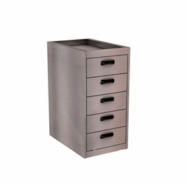 Estrutura em Aço Inox; 05 unid. Gavetas Alt. 136 mm em Aço Inox; 05 conj. Corrediças Telescópica p/ gavetas; 05 unid. Puxador das gavetas em Nylon; 04 unid. Pés Nivelador;