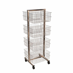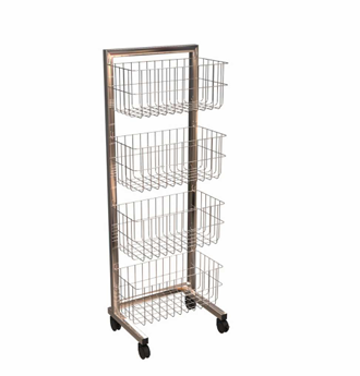 Estrutura em Aço Inox; 08 unid. Cestos Removíveis, medida L-610 x P-310; 04 unid. Rodízios giratório 75mm (sendo 2 un c/ freio).