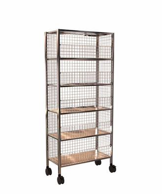 Estrutura em Aço Inox; 05 unid. Prateleira fixa c/ Reforço e Frontal Aramado basculante; 04 unid. Rodízios Giratório 100mm (sendo 2 un c/ freio);