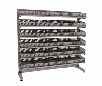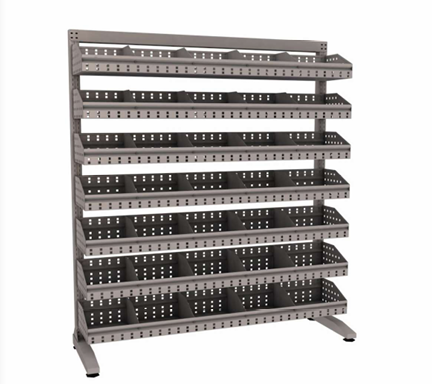 Estrutura em Aço Carbono Sae 1010; 07 unid. Cestos (L-1500 x P- 300mm) ajustáveis c/ 4 Divisórias por Cesto em Aço Carbono; 04 unid. Pés niveladores;
