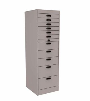 Estrutura em aço Carbono SAE 1010; 06 unid. Gavetas Alt. 90,0 mm em Aço Carbono; 03 unid. gavetas Alt. 183,0 mm em Aço Carbono; 02 unid. Gavetas Alt. 276,0 mm em Aço Carbono; 09 conj. Corrediças Telescópia p/ Gavetas; 09 unid. Puxador das Gavetas em Nylon; 01 unid. Sitema de Lacre único para travar as Gavetas simultaneamente; 04 unid. Pés niveladores
