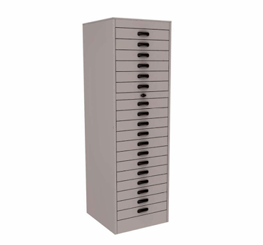 Estrutura em Aço Carbono SAE 1010; 18 unid. Gavetas Alt. 90,0 mm em Aço Carbono; 18 conj. Corrediças Telescópia p/ Gavetas; 18 unid. Puxador das gavetas em Nylon; 01 unid Sitema de Lacre único para travar as Gavetas simultaneamente; 04 unid. Pés niveladores;