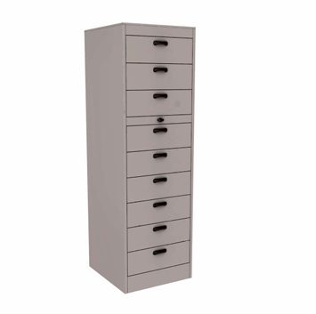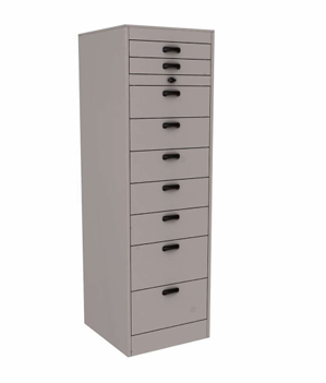 Estrutura em Aço Carbono SAE 1010; 09 unid. Gavetas Alt. 183,0 mm em Aço Carbono; 09 conj. Corrediças Telescópica p/ Gavetas; 09 unid Puxador das Gavetas em Nylon 01 unid. Sistema de Lacre único para travar as gavetas simultaneamente; 04 unid. Pés niveladores;