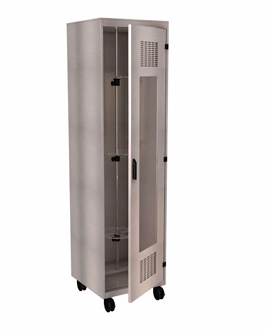 Estrutura em Aço Inox 01 unid. Porta Aço inox c/ visor em Policarbonato e com Venezianas para ventilação Natural; 01 unid. Fecho Cremona; 01 Conjuto de Suporte Ajustável para Armazenamento de até 12 Endoscópios; 04 unid. Rodízios giratório 100mm (sendo 2 un c/ freio);