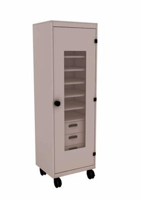 Estrutura em Aço Carbono SAE 1010; 01 unid. Porta Aço Carbono c/ visor em Policarbonato; 01 unid. Fecho Eletrônico com senha acesso; 07 unid. Prateleira Fixa em Aço carbono; 04 unid. gavetas Alt 140,0mm em Aço Carbono; 04 conj. Corrediças Telescópica p/ Gavetas; 04 unid. Puxador das gavetas em Nylon; 04 unid. Rodízios giratório 100mm (sendo 2 un c/ freio);