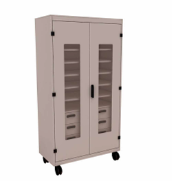 Estrutura em Aço Carbono SAE 1010; 02 unid. Porta Aço Carbono c/ visor em Policarbonato; 01 unid. Fecho Cremona; 07 unid. Prateleiras Fixa em Aço carbono; 08 unid. gavetas Alt 140,0mm em Aço Carbono; 08 conj. Corrediças Telescópica p/ gavetas; 08 unid. Puxador das Gavetas em Nylon; 04 unid. Rodízios giratório 100mm (sendo 2 un c/ freio);