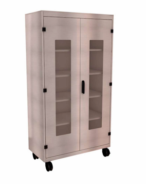 Estrutura em Aço Inox; 02 unid. Porta Aço Inox c/ visor em Policarbonato; 01 unid. Fecho Cremona; 04 unid. Prateleira Fixa em Aço Inox; 04 unid. Rodízios giratório 100mm (sendo 2 un c/freio);