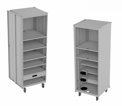 Estrutura em aço Carbono SAE 1010; 01 Suporte p/ cilindro com velcro; Furação p/ passagem de cabos; 02 unid. Portas c/ abertura de 180° Trava p/ porta; 01 unid. Suporte p/ Cilindro de gás; 01 unid. Borracha p/ apoio do cilindro; 02 unid. Bandejas c/ ajuste de altura (575 x 595); 01 unid. gaveta (Alt. 100mm); 03 unid. Bandejas c/ ajuste de altura (575 x 390); 04 Rodízios giratórios de 100mm de diâmetro, sendo 2 unid. c/ freio)